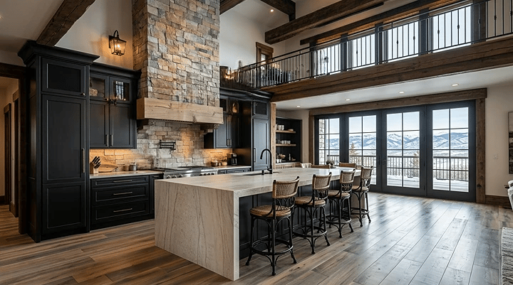In a mountain home like this, the deeper cabinet tones feel natural. They echo the surrounding landscape, the timber beams, and the rugged textures of stone. Instead of competing with the architecture, they support it.